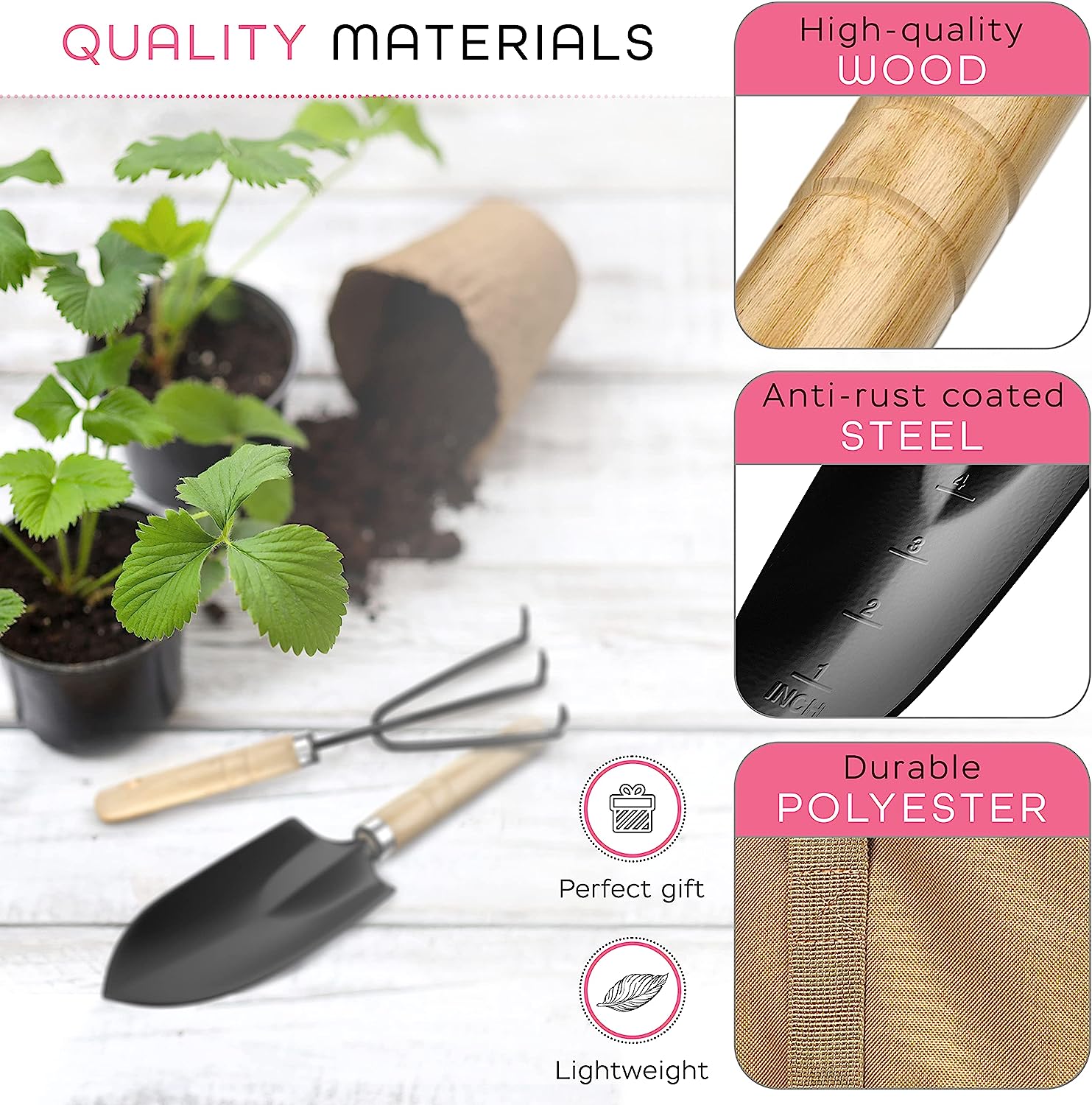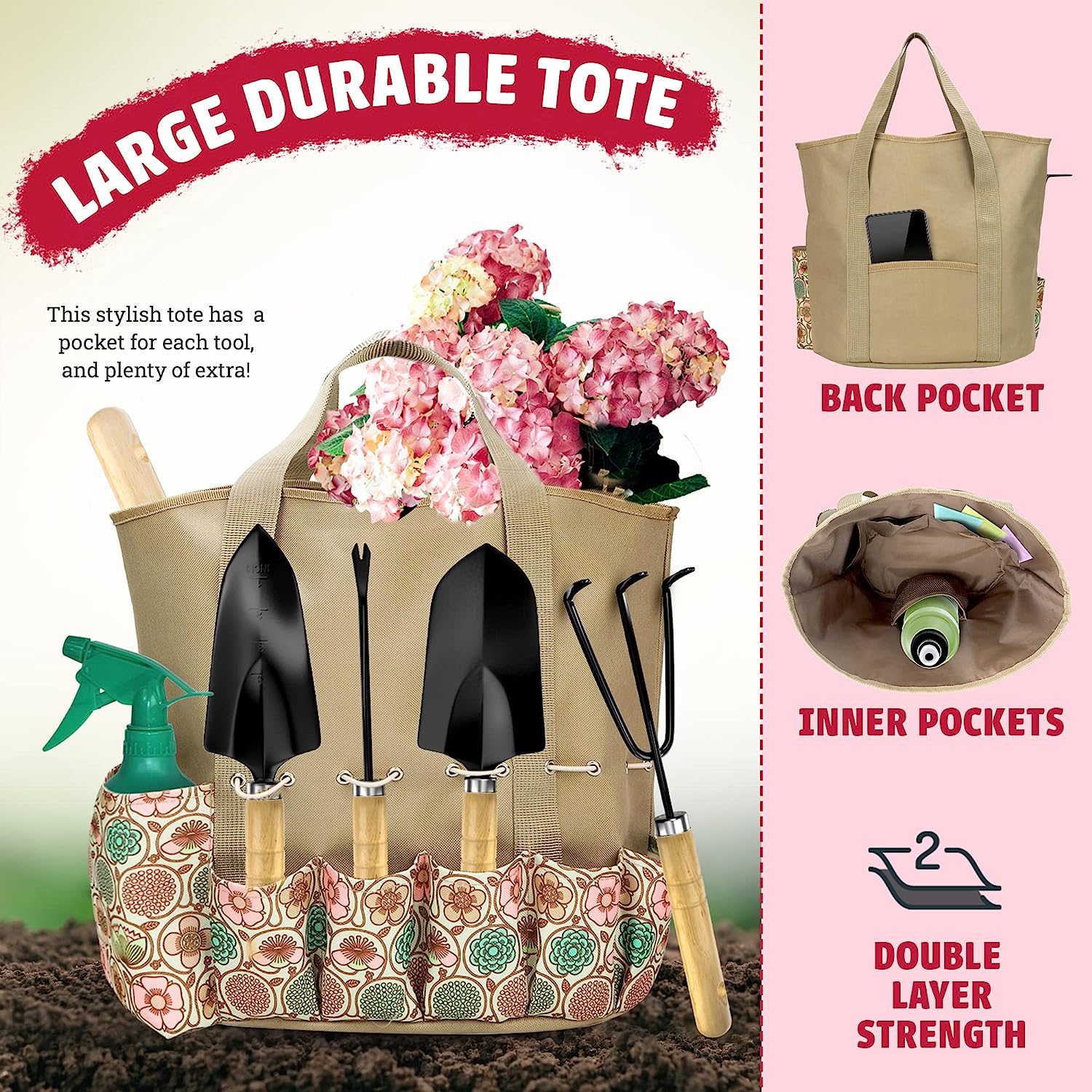 - PACKED GARDEN TOOL KIT: 8 in 1 Garden tool Set Includes 8 Gardening supplies 1.gardening shovel 2.Mini rake 3.Trowel 4. cultivator 5.Hand Weeder 6. Transplanting Spade 7.Heavy Duty Gloves 8.Premium Garden Tote Bag