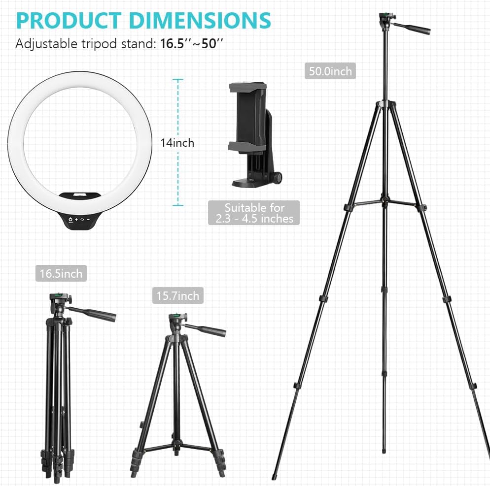 - 【Fully customizable portable tripod Stand】 Extending from 15.7 inches to 50 inches, our tripod can be adjusted to any height within seconds as needed, short enough to stand on tabletop, tall enough to fit your height. This compact circle light set comes handy when you do makeup, artworks, beauty & fashion live streaming, video calls and more.