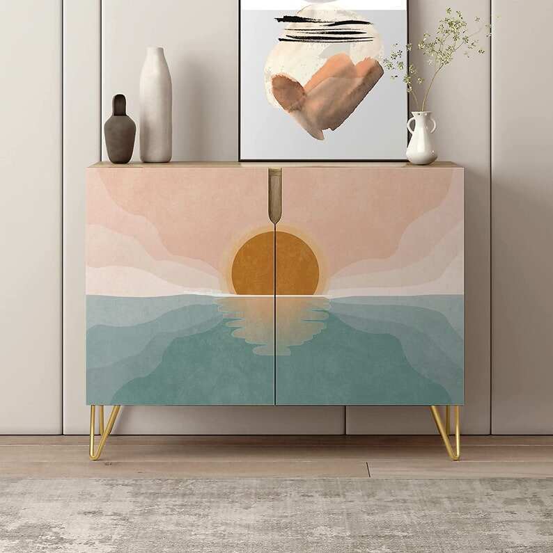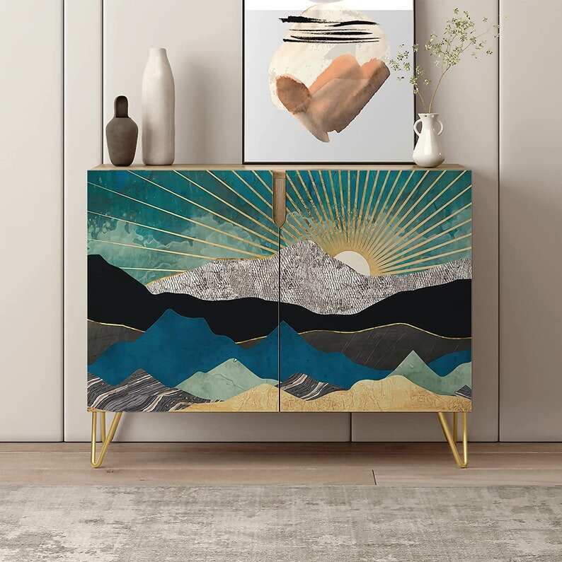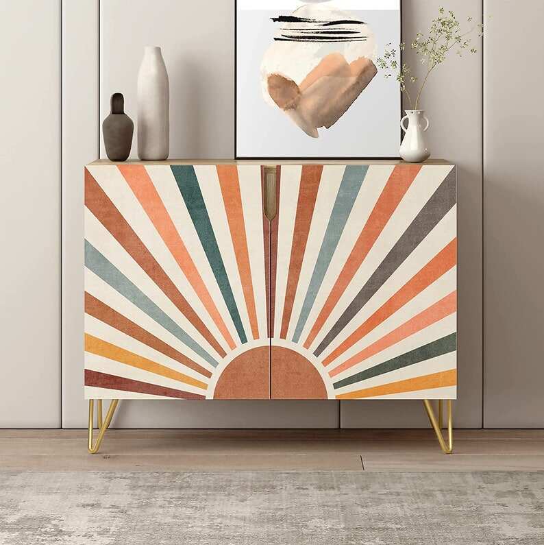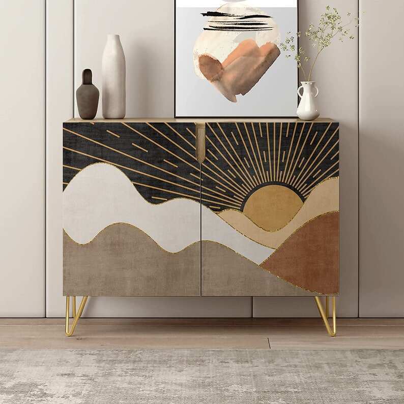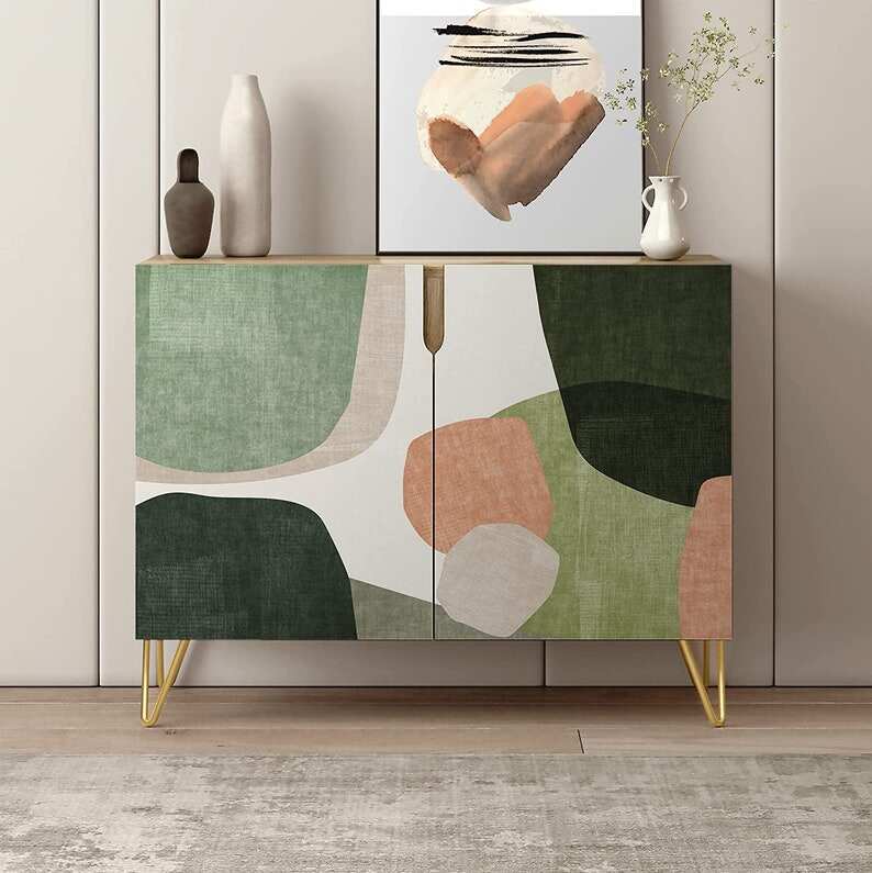 • SIGNWIN Sideboard Buffet Cabinet, Kitchen Storage Cabinet w/ 2 Doors, Mid Century Modern Abstract Pattern, Cupboard Console Table for Dining