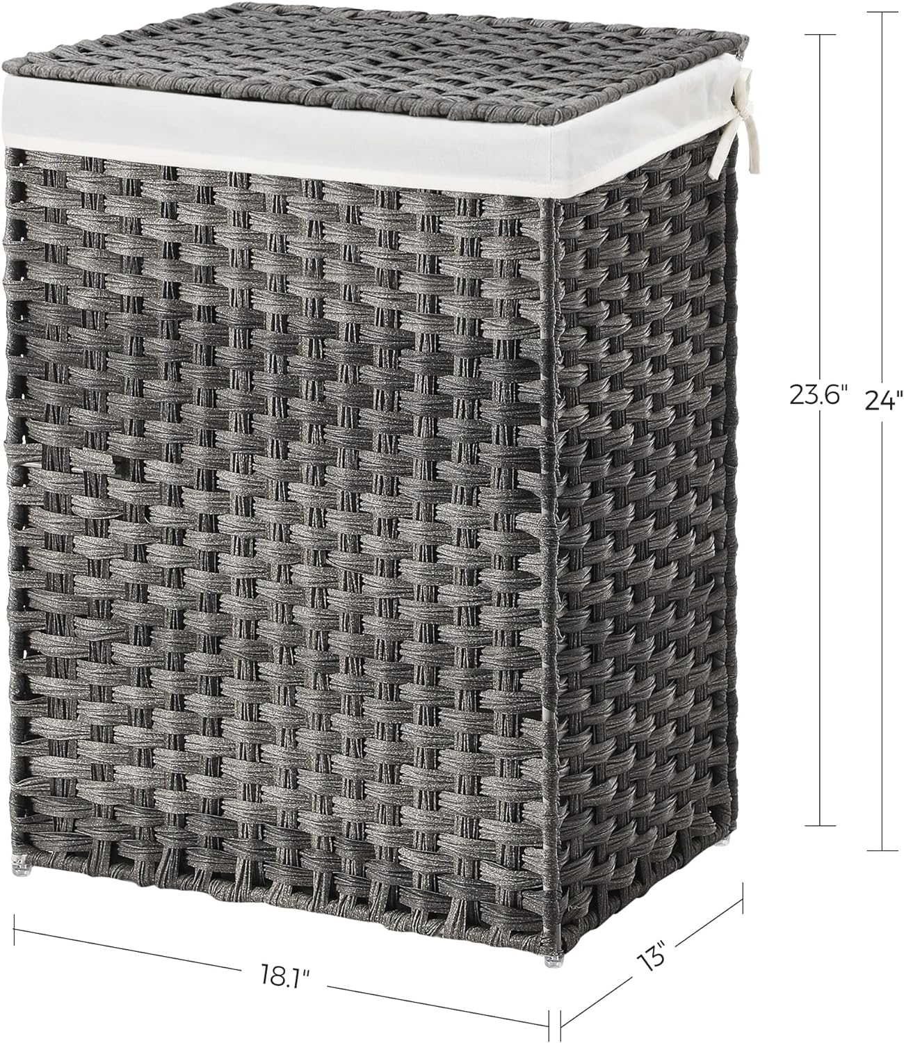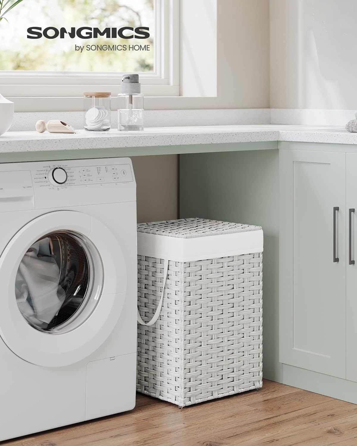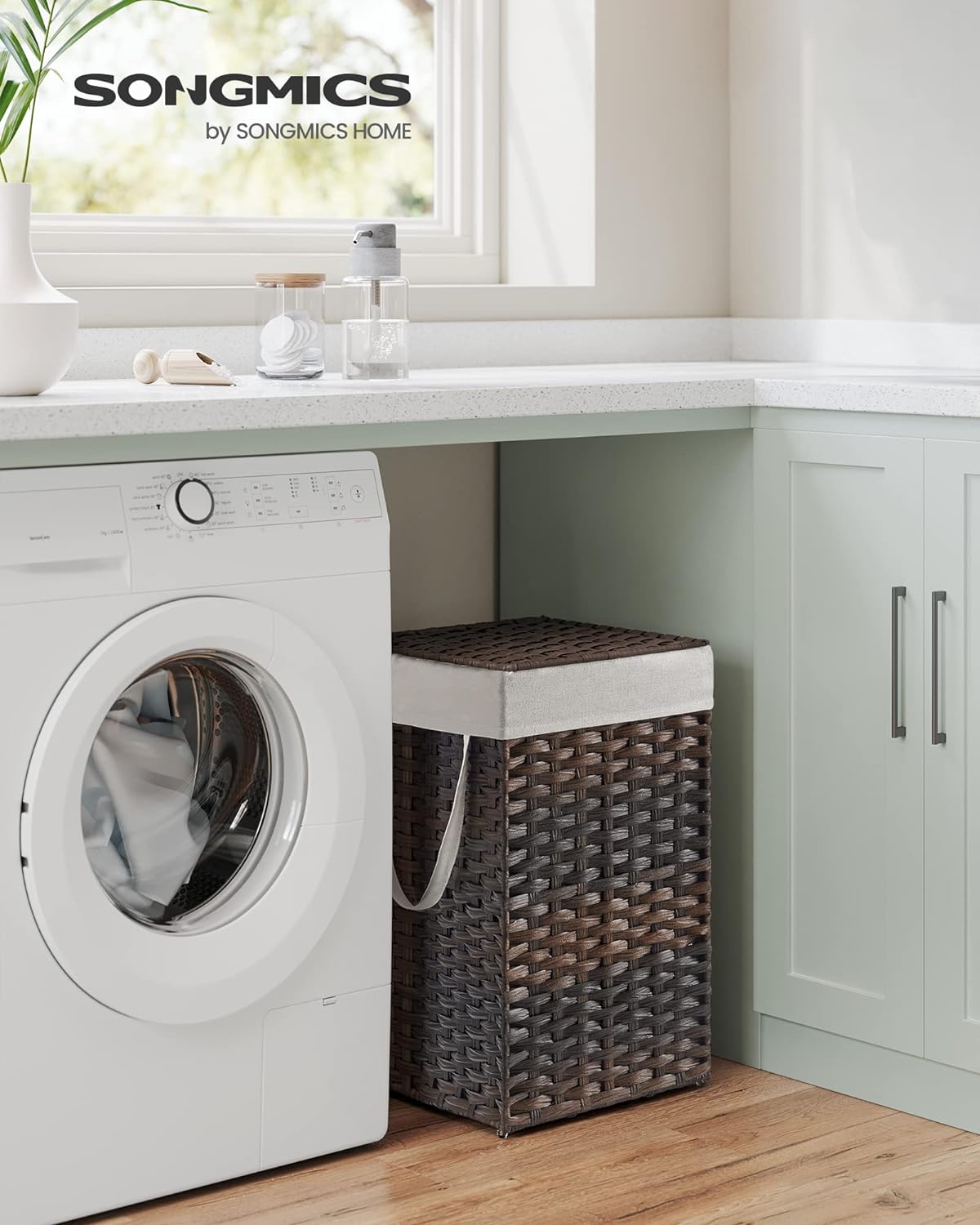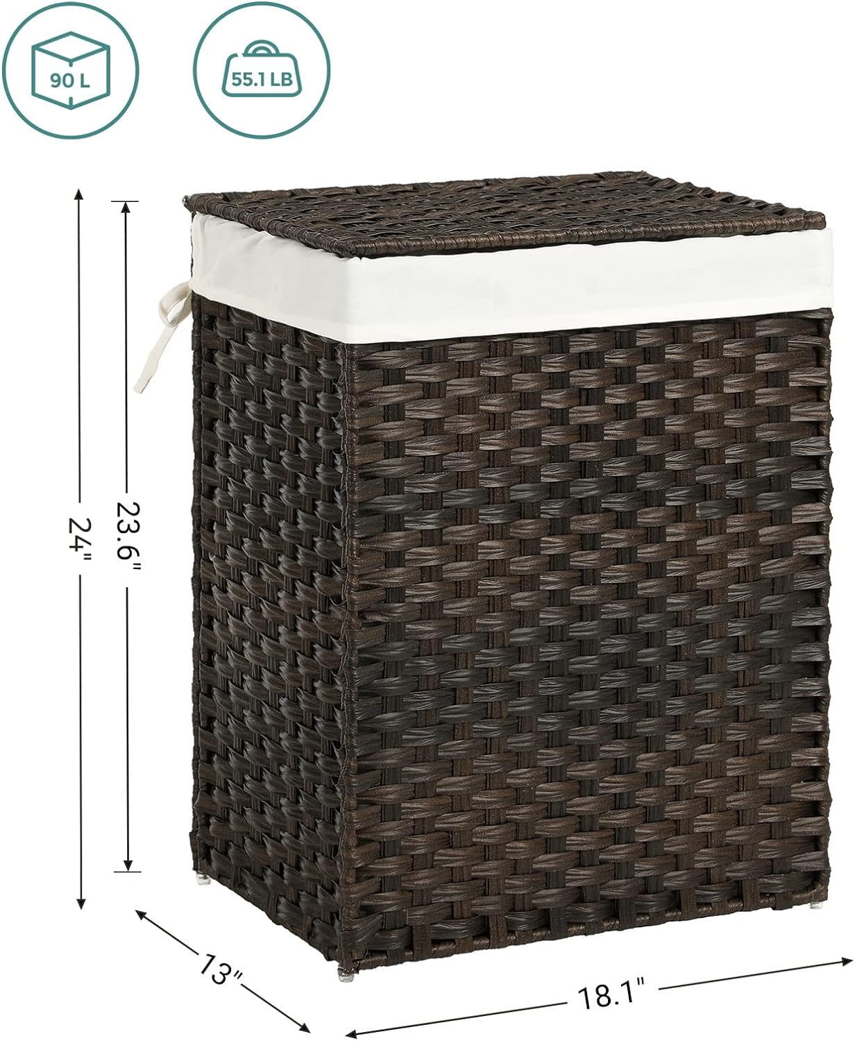 • SONGMICS Handwoven Laundry Hamper, 23.8 Gal (90L) Synthetic Rattan Clothes Laundry Basket with Lid and Handles, Foldable, Removable Liner Bag, Natural ULCB51NL