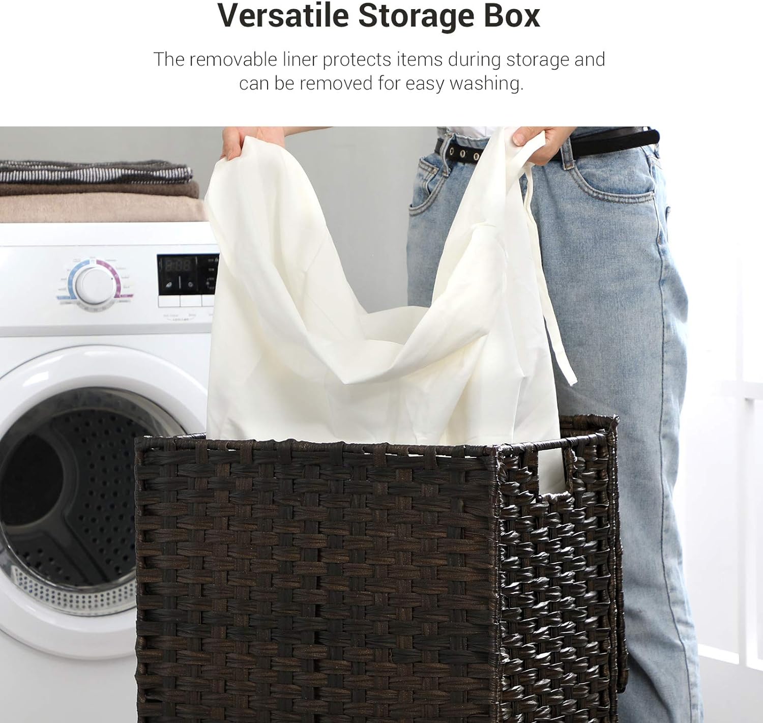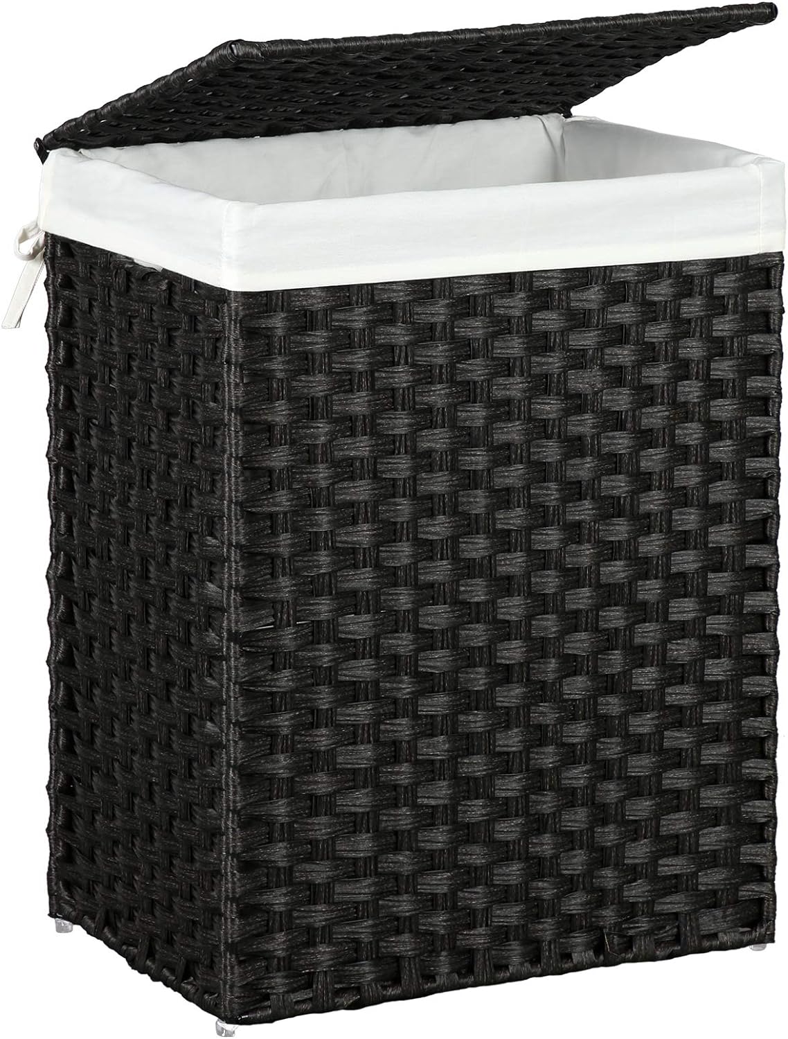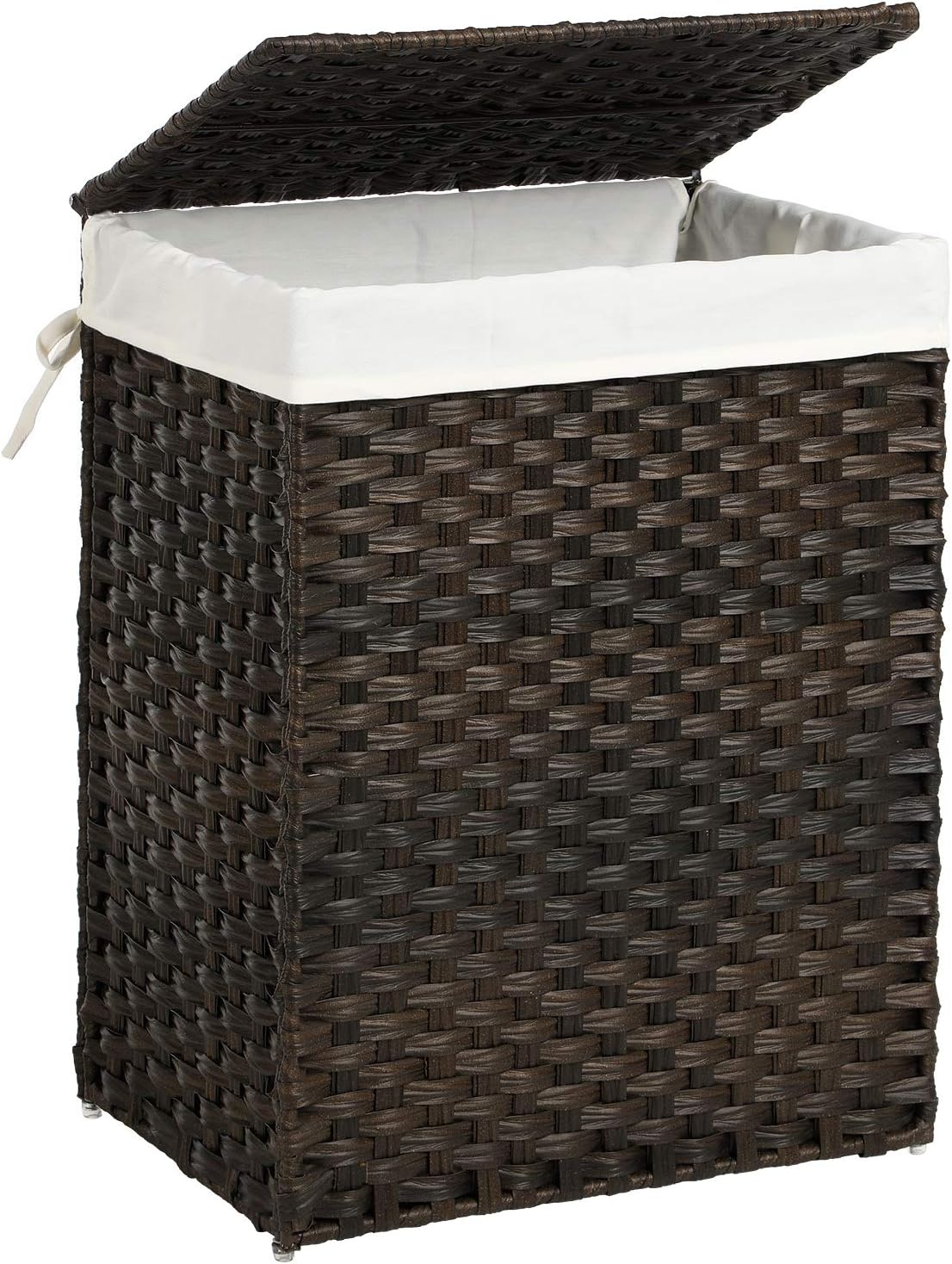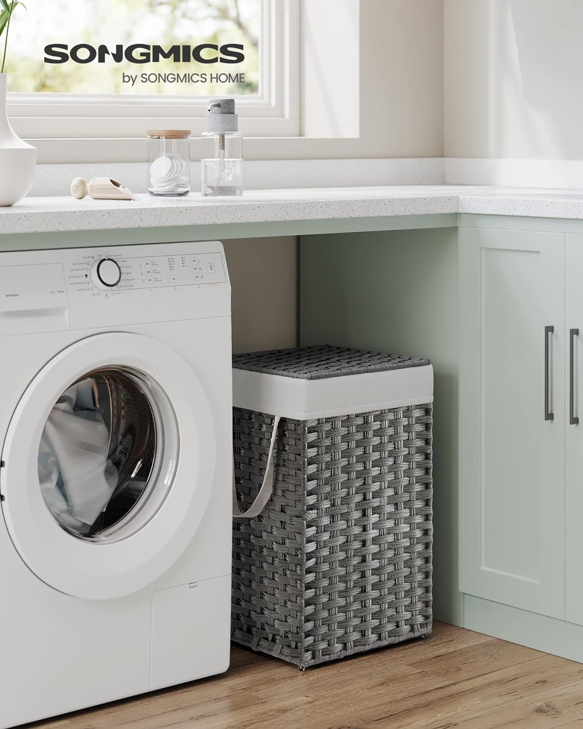 • SONGMICS Handwoven Laundry Hamper, 23.8 Gal (90L) Synthetic Rattan Clothes Laundry Basket with Lid and Handles, Foldable, Removable Liner Bag, Natural ULCB51NL