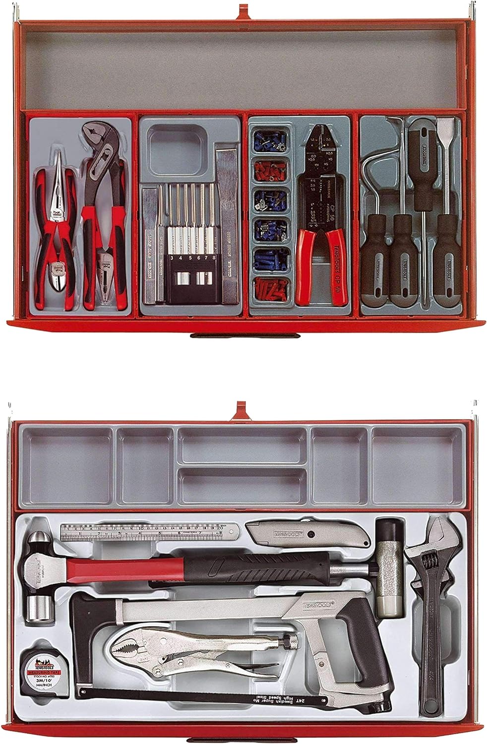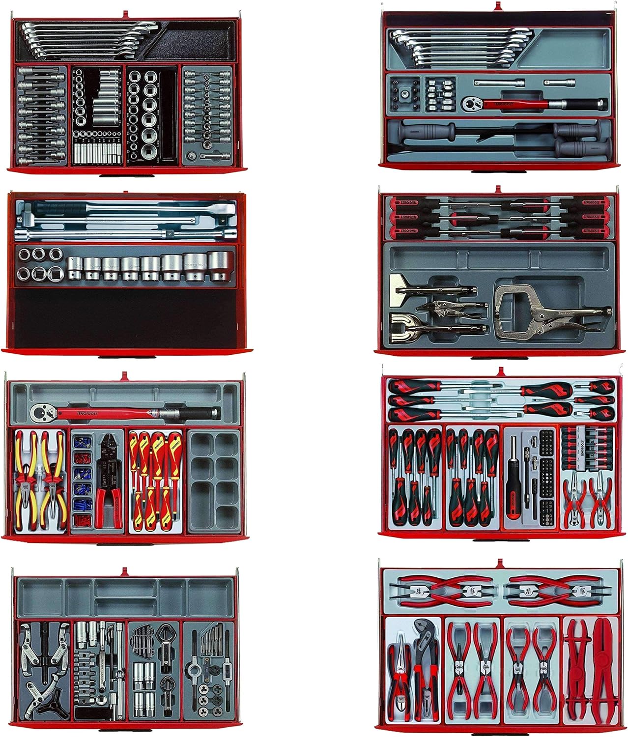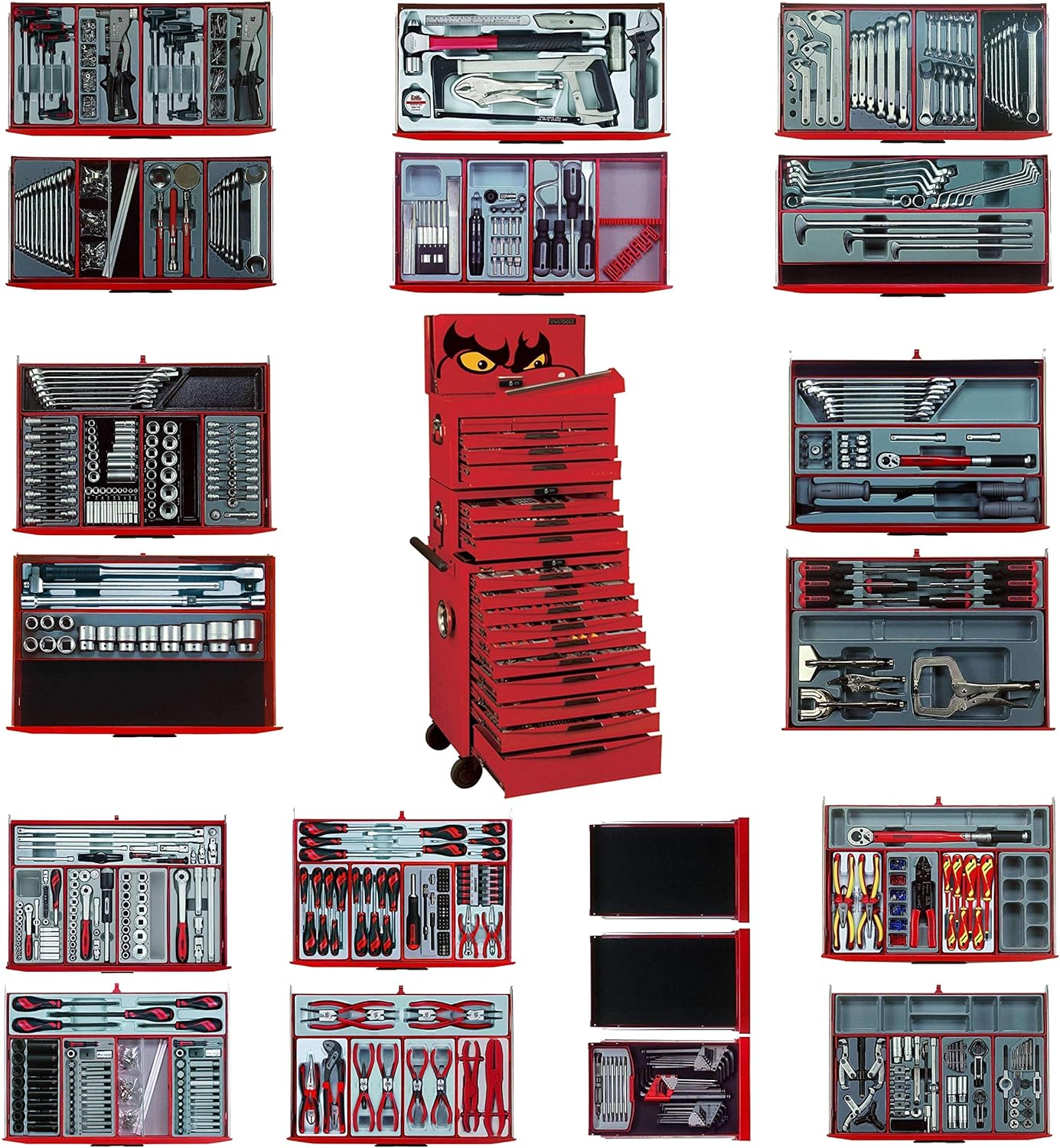 - 87 wrenches/spanners, 135 TX/Hex bits & drivers, 6 empty add on trays, 95 impact tools, 13 extensions, 16 piece mini tool set, 121 piece crimping pliers set