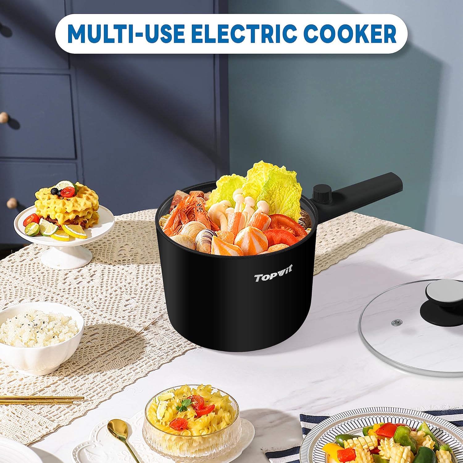 • Topwit Hot Pot Electric, 1.5L Ramen Cooker, Portable Non-Stick Frying Pan, Electric Pot for Pasta, Steak, BPA Free, Electric Cooker with Dual Power Control, Over-Heating & Boil Dry Protection, Black