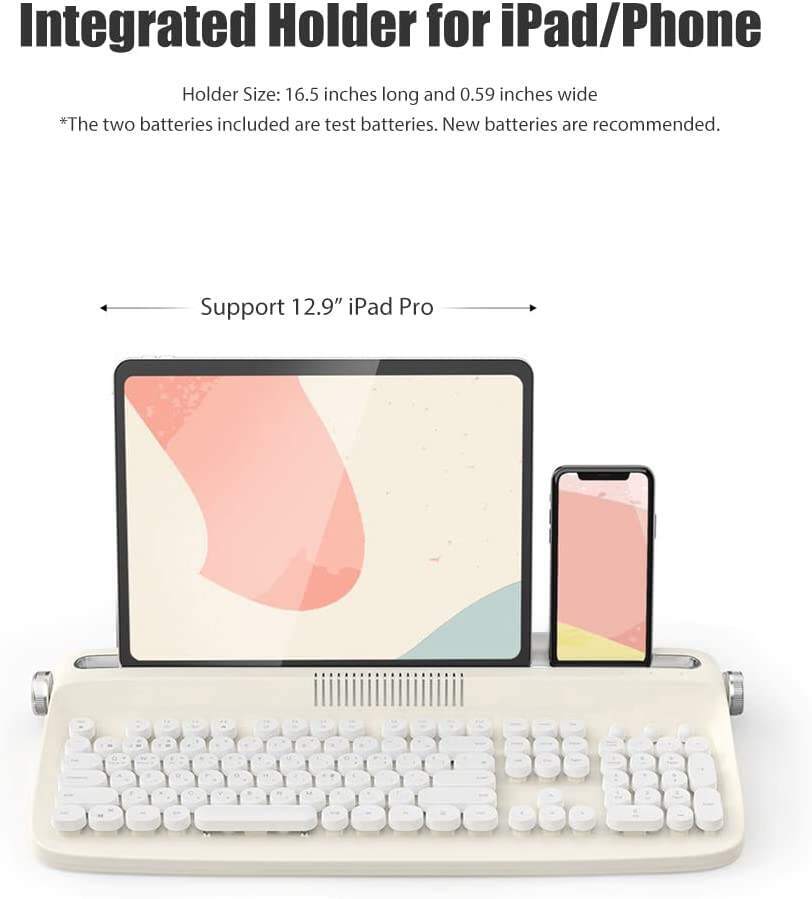 - [Integrated Stand for Pad/Phone] - Built-in a tablet/phone holder, 16.5 inches long and 0.59 inches wide. Supports 12.9" iPad Pro. The keyboard also includes adjustable button feet alleviate pressure on your wrist from typing at an elevated angle.